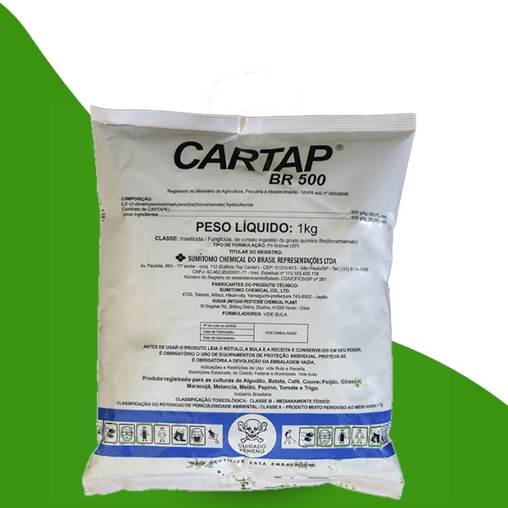 Cartap 500 inseticida-fungicida empregado no controle de inúmeras pragas em diversas culturas e também para doenças na cultura do feijoeiro, Melancia, Melão, Batata, Algodão, Couve, Pepino, Maracujá, Café, Tomate,Trigo e Girassol